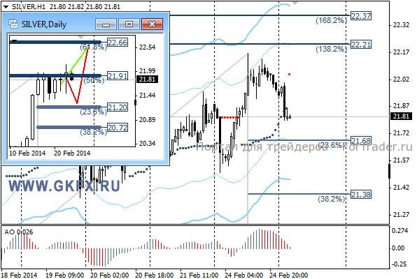 Цены на серебро выходили из отмеченного диапазона, указывая на продолжение роста после недельной коррекции. Традиционно делаю два варианта движения цены на неделю, основной красный и альтернативный зеленый. Значимые уровни на сегодня отмечены на часовом графике. Индикатор АО находится в положительной зоне и снижается, указывая на коррекцию перед возможным продолжением роста. Индикатор тренда указывает на рост. Покупки от 21,70 с целями 21,90, 22,10 и 22,35.