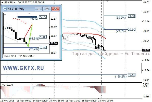 Цены на золото, несмотря на ожидания роста, снизились. Возможно, это связано с ожиданием протоколов заседания ФРС, которые будут представлены в среду. Участники рынка страхуются от неожиданностей. Рынок будет интересовать настрой ФРС в отношении программы стимулирования экономики США. Сделка по рекомендации не исполнилась. Традиционно делаю два варианта движения цены на неделю, основной красный и альтернативный зеленый. Значимые уровни на сегодня отмечены на часовом графике. Индикатор АО находится в отрицательной зоне и растет, указывая на коррекцию перед возможным продолжением снижения. Индикатор тренда указывает на снижение. Вне рынка.