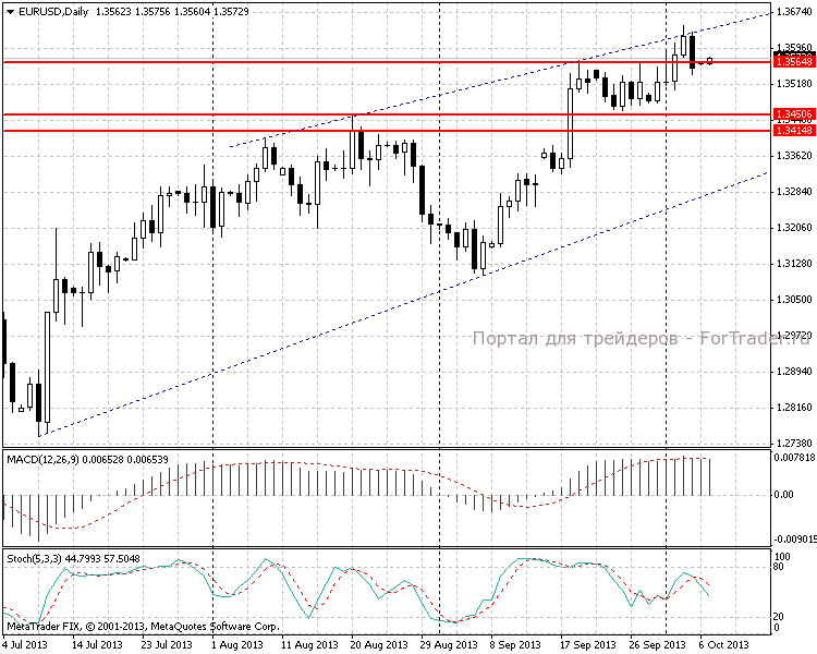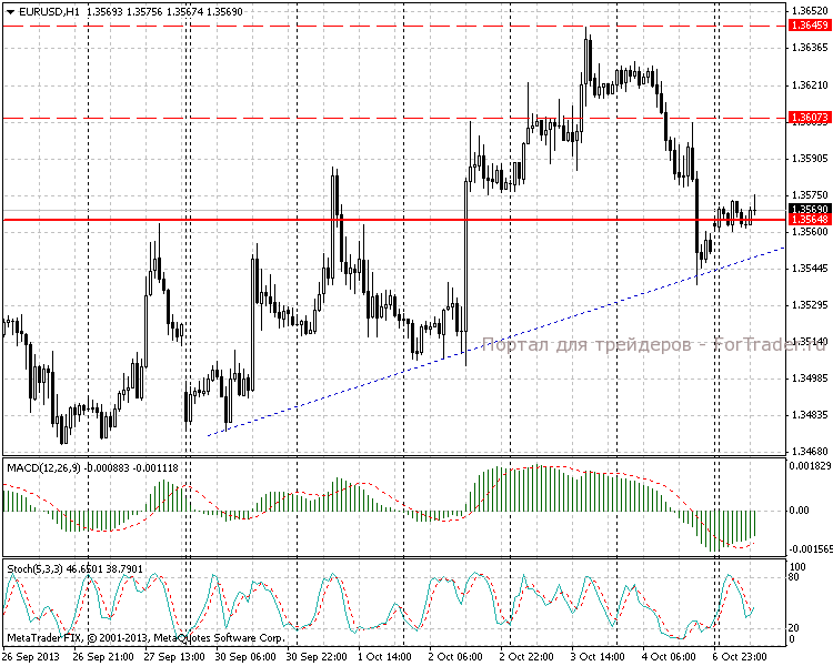 На часовом графике видим, что цена отскочила от линии тренда, проведенной по минимумам 30.09 и 2.10.13. Открытие текущих недельных торгов произошло с незначительным гэпом вверх на 11 пунктов. Во время азиатской сессии гэп закрыт не был, и цена продолжила колебаться в узком диапазоне 1,3560-1,3573. Гистограмма MACD развернула направление и пересекла сигнальную линию снизу-вверх, что можно расценивать как признак начала нового восхождения.