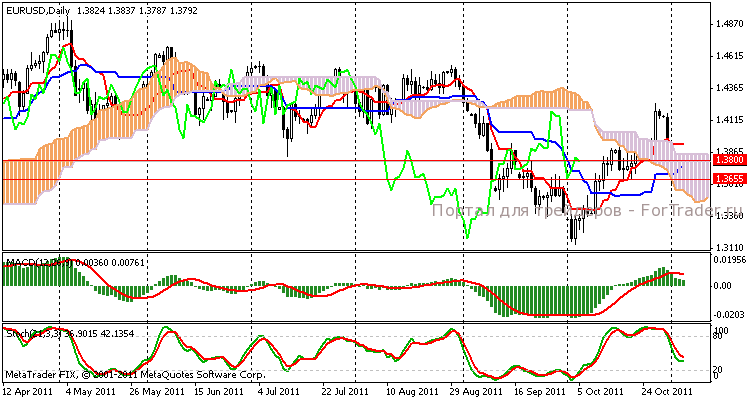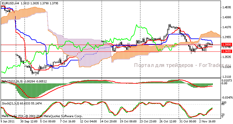 На момент написания обзора, торги на 4-х часовом графике ниже облака Ишимоку между линиями Kjun-sen и Tenkan-sen. Покупатели осуществили попытку пробить важный уровень 1,3800 вверх и закрепится за ним, но продавцы не сдают своих позиций и продолжают вытеснять «быков».