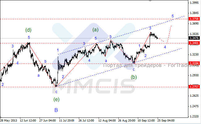 Основным сценарием на сегодня остается снижение котировок к отметке 1.3401, где и будет завершена коррекционная волна «4». В качестве альтернативного сценария рассматривается возможность завершения волны «4» в районе текущих минимумов и возобновление роста пары в рамках волны «5».