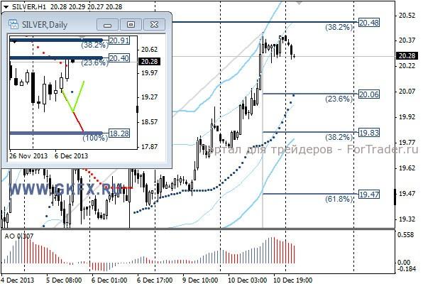 Цены на серебро вчера уверено преодолели сопротивление, прохождение которого я не ожидал. Вероятно покупательская способность очень значительная, поэтому можно рассматривать дальнейшие покупки. Традиционно делаю два варианта движения цены на неделю, основной красный и альтернативный зеленый. Значимые уровни на сегодня отмечены на часовом графике. Индикатор АО находится в положительной зоне и снижается, указывая на коррекцию перед возможным продолжением роста. Индикатор тренда указывает на рост. Покупки от 20,00 с целями 20,20, 20,50 и 20,90.