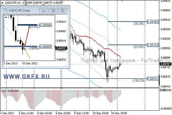 Пара USDCHF продолжила снижение, преодолев важный уровень 0,8888, который является минимумом октября этого года и в результате снижалась до минимумов ноября 2011 года. Это говорит о том, что снижение вполне может продолжиться как минимум до 0,8750. На эту неделю традиционно рассматриваю два варианта возможного движения цены, основной красный и альтернативный зеленый. Значимые уровни на сегодня отмечены на часовом графике. Индикатор АО находится в отрицательной зоне и растет, указывая на коррекцию перед возможным продолжением снижения. Индикатор тренда указывает на снижение. Продажи от 0,8885 с целями 0,8865 и 0,8850.