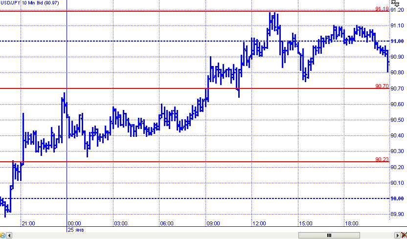 Пара доллар/иена, как и предполагалось, продолжила формировать восходящее движение. Цены смогли перодолеть сопротивление на 90,70 и прошли отметку 91,00. Обновив максимум на уровне 91,19, пара все же начала откат и торговые сутки завершила на отметке 90,90.