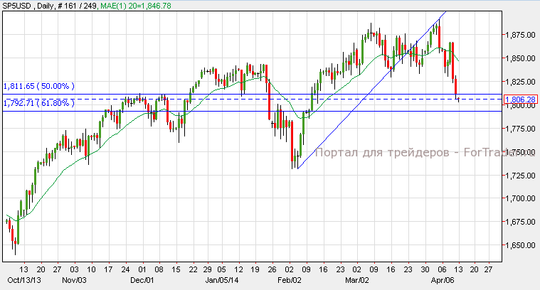 Американские индексы завершили торговую неделю понижением после выхода негативного отчета о доходах за первый квартал 2014 года. NASDAQ упал на 1.17%, S&P 500 упал на 0.95%, а Dow Jones потерял от стоимости 0.89%. Согласно техническому анализу дневного графика, S&P 500 торгуется с нисходящем импульсом ниже 50%-ного уровня коррекции Фибоначчи на отметке 1811. Задержка на этом уровне приведет индекс к отметке 1,730, однако прорыв уровня сопротивления 1,811 вызовет рост к отметке 1,825.