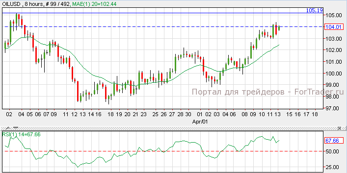 Нефть подорожала после выхода позитивного предварительного индикатора доверия потребителей от Мичиганского университета (Prelim UoM Consumer Sentiment). Согласно техническому анализу 8-часового графика, нефть продолжает рост к цене 105$ за баррель. Прорыв этого уровня приведет нефть к отметке 110$. Индикатор относительной силы находится на отметке 67, которая указывает на то, что нефть торгуется в зоне перепроданности и может резко упасть.