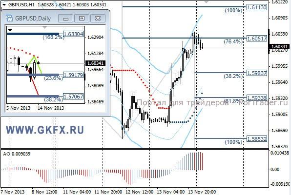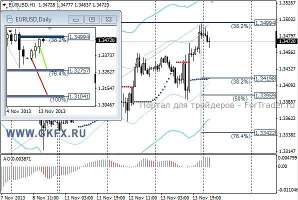 Пара EURUSD проверила на прочность 1,3400, но не смогла его преодолеть. В итоге пара направилась к уровню 1,3500 в соответствии с ожиданиями. Сегодня по паре внимание будет направлено на данные по ВВП за третий квартал в Еврозоне. Вероятно, эти данные станут сегодняшним драйвером для пары. На эту неделю традиционно рассматриваю два варианта возможного движения цены, основной красный и альтернативный зеленый. Значимые уровни на сегодня отмечены на часовом графике. Индикатор АО находится в положительной зоне и снижается, указывая на коррекцию перед возможным продолжением роста. Индикатор тренда указывает на рост. Преодоление 1,3440 даст возможность для продаж с целями 1,3400, 1,3370 и 1,3340.