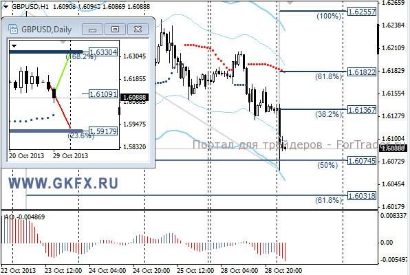 Пара GBPUSD уже начала снижение толчком для этого послужили слабые данные по Великобритании. Сегодня утром уже был пройден уровень 1,6117 для продаж, поэтому рекомендаций на сегодня уже нет. На этой неделе по традиции рассматриваю два варианта возможного движения цены, основной красный и альтернативный зеленый. Значимые уровни на сегодня отмечены на часовом графике. Индикатор АО находится в отрицательной зоне и снижается, указывая на желание пары двигаться вниз. Индикатор тренда указывает на снижение. Вне рынка.