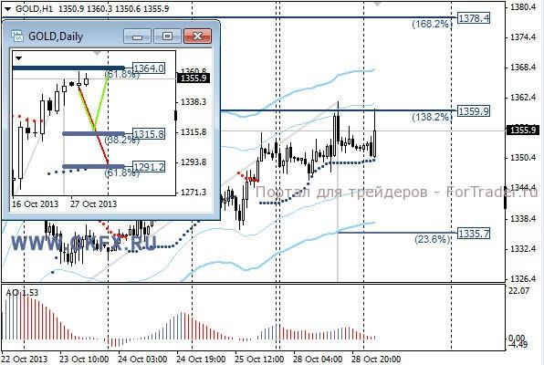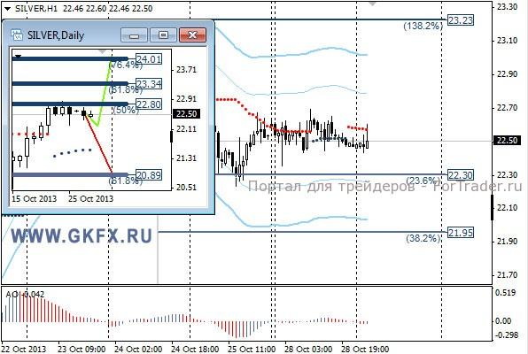 Цены на золото проторговали первый день недели почти без изменений, хотя внутри дня был рывок к 1360,0, тем самым закрыв позицию по рекомендации с прибылью. Перед заседанием ФРС, которое закончится в среду, рынок драгметаллов будет малоактивным. Если по результатам заседания участники рынка получат подтверждение переноса сокращения программы стимулирования экономики США, тогда цены на золото могут продолжить рост. Традиционно делаю два варианта движения цены на неделю, основной красный и альтернативный зеленый. Значимые уровни на сегодня отмечены на часовом графике. Индикатор АО находится в положительной зоне и растет, указывая на желание инструмента двигаться вверх. Индикатор тренда указывает на рост. Вне рынка.