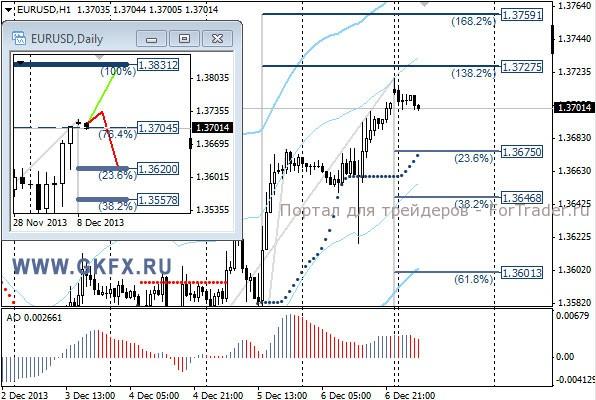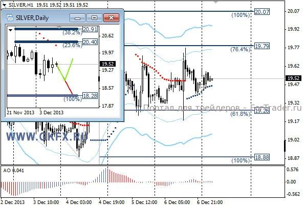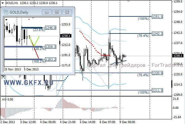 Цены на золото после выхода американской статистики по рынку труда США в пятницу опускались к минимумам недели. Однако впоследствии вернулись обратно и поднимались к максимумам недели. Желания у участников рынка в пятницу гнать цены вниз, похоже не было, однако рано или поздно это случиться, так как статистика по США выходила очень сильная, что усиливает мнение о сокращении QE3 на следующей неделе. По золоту отработал красный сценарий на прошедшей неделе. Традиционно делаю два варианта движения цены на неделю, основной красный и альтернативный зеленый. Значимые уровни на сегодня отмечены на часовом графике. Индикатор АО находится у нуля, указывая на неопределенность. Индикатор тренда указывает на рост. Смотрим за предпочтениями рынка.