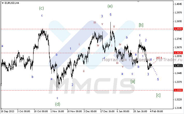 Вчера пара евро/доллар продолжила консолидироваться в рамках усложненной коррекционной волны «4». Но технические аналитики по-прежнему рассматривают дальнейшее снижение пары в условиях основного сценария, согласно которому формирование волны «5» нисходящего импульса «[с]» старшего порядка мы можем увидеть уже сегодня. В таком случае в качестве целевого уровня данной волны аналитики рассматривают основание 34-й фигуры. Альтернативный сценарий тоже не изменился и предполагает удлинение четвертой волны в рамках коррекционной волны «Alt:4».
