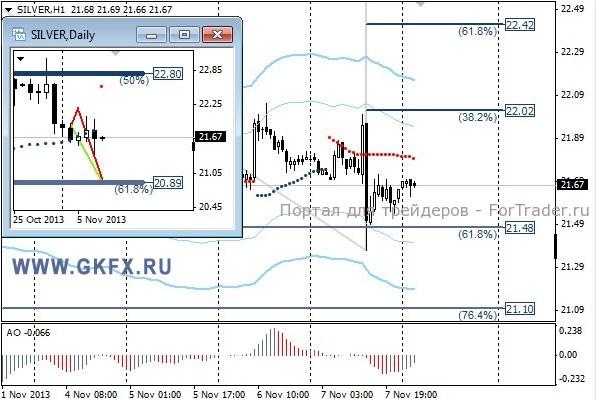Цены на серебро также делали рывок вниз выполнив условие по рекомендации. Однако цель достигнута не была и сделка получилась отрицательной. Традиционно делаю два варианта движения цены на неделю, основной красный и альтернативный зеленый. Значимые уровни на сегодня отмечены на часовом графике. Индикатор АО находится в отрицательной зоне и растет, указывая на коррекцию перед возможным продолжением снижения. Индикатор тренда указывает на снижение. Под сегодняшние данные по США рекомендаций не даю.