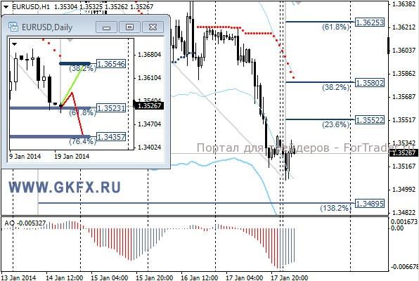 Пара GBPUSD резко выросла на сильных данных по розничным продажам в Великобритании. По рекомендации сделка не исполнена, так как условие остановки цены на уровнях 1,6370/90 не произошло. Фунт опять движется по своему в отличии от евро. Сегодня в США выходной, поэтому волатильность на рынке будет ниже обычного, а с учетом пятничного движения, сегодня будет коррекция. Прошедшая неделя не отработала не один из сценариев. На этой неделе по традиции рассматриваю два варианта возможного движения цены, основной красный и альтернативный зеленый. Значимые уровни на сегодня отмечены на часовом графике. Индикатор АО находится в положительной зоне и снижается, указывая на коррекцию перед возможным продолжением роста. Индикатор тренда указывает на рост. Сегодня выступаем в роли наблюдателей.