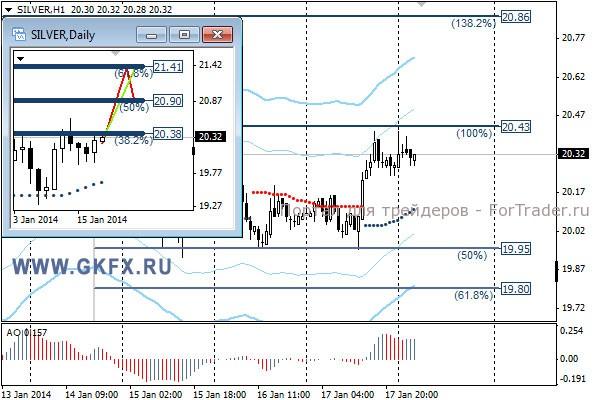 Цены на серебро не смогли преодолеть отметку для выполнения условия на продажу, поэтому сделка не исполнена. Ожидаемого снижения не произошло, ситуация пока не понятна. Прошедшая неделя не отработала не один из сценариев. Традиционно делаю два варианта движения цены на неделю, основной красный и альтернативный зеленый. Значимые уровни на сегодня отмечены на часовом графике. Индикатор АО находится в положительной зоне и снижается, указывая на коррекцию перед возможным продолжением роста. Индикатор тренда указывает на рост. Сегодня наблюдаем за намерением участников рынка.