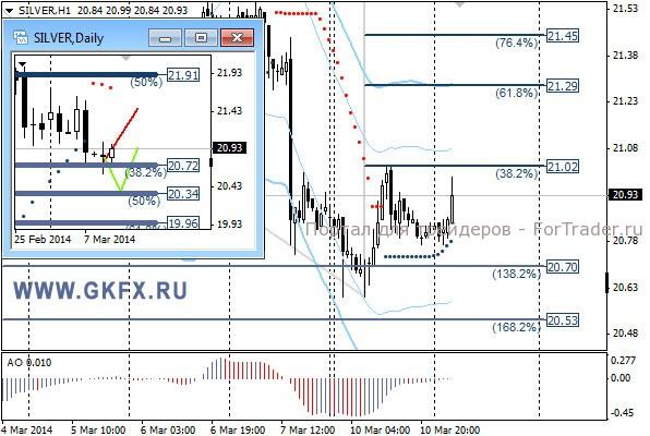 Цены на серебро проявляли вчера слабость и отметили новые минимумы с середины февраля. Сегодня лучше еще день выждать, чтобы сформировалась какая-то повышающая конструкция, а затем искать вход. Традиционно делаю два варианта движения цены на неделю, основной красный и альтернативный зеленый. Значимые уровни на сегодня отмечены на часовом графике. Индикатор АО находится у нуля, указывая на неопределенность. Индикатор тренда указывает на рост. Вне рынка.