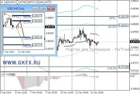 Пара USDCHF не доходила до ожидаемой отметки и возможно это случится сегодня. По-прежнему ожидаю роста пары к 0,8825 в рамках коррекции и возобновления снижения. Сегодня можно посмотреть, как пара поведет себя у уровня 0,8825, если до этого уровня дойдет. Если у уровня будут признаки нежелания расти дальше, можно поискать продаж. На эту неделю традиционно рассматриваю два варианта возможного движения цены, основной красный и альтернативный зеленый. Значимые уровни на сегодня отмечены на часовом графике. Индикатор АО находится у нуля, указывая на неопределенность. Индикатор тренда указывает на снижение. Вход в продажи из района 0,8815/25 с целями 0,8790, 0,8760 и 0,8730.
