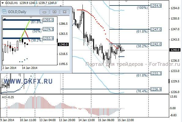 Цены на золото снижались в соответствии с ожиданиями. Дополнительный импульс для роста доллара вчера дали данные по США, которые оказались лучше ожиданий. Это отбросило цены на золото ниже 1235,0. Однако позднее цены на золото немного восстановились. Сегодня можно не спеша поискать выгодную цену для продаж, так как вероятно сегодня будет день коррекции. Только на американских торгах вероятно снижение продолжится. Традиционно делаю два варианта движения цены на неделю, основной красный и альтернативный зеленый. Значимые уровни на сегодня отмечены на часовом графике. Индикатор АО находится у нуля, указывая на неопределенность в данное время. Индикатор тренда указывает на рост. Рост к уровню 1242/46,0 будет выгодной продажей с целями 1237,0 и 1232,0.