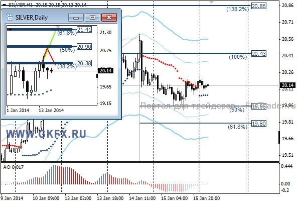 Цены на серебро не сделали ожидаемого отката наверх, а продолжили снижение. Однако снижение было незначительным и цены уже сегодня вернулись к уровням потенциального входа. Можно не торопясь поискать выгодную цену для продаж. Традиционно делаю два варианта движения цены на неделю, основной красный и альтернативный зеленый. Значимые уровни на сегодня отмечены на часовом графике. Индикатор АО находится у нуля, указывая на неопределенность в данное время. Индикатор тренда указывает на рост. Рост к уровню 20,20/40 будет выгодной продажей с целями 20,00, 19,85 и 19,70.