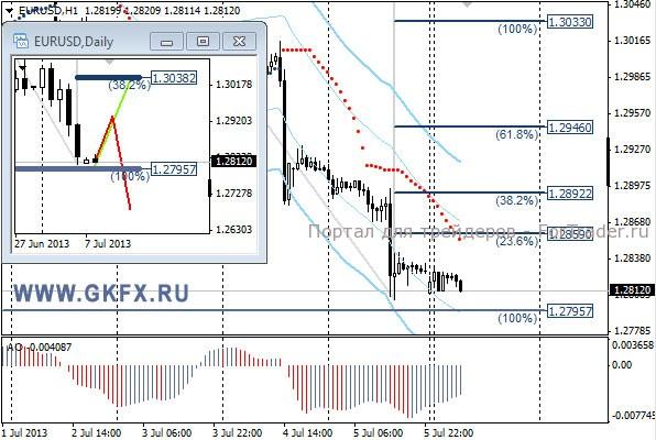 Пара EURUSD продолжила падение после сильных данных по рынку труда США. Данные оказались чрезвычайно хорошими, что и вызвало такой серьезный рост доллара. Показатель вышел близкий к 200к новых рабочих мест, а такой показатель свидетельствует о выздоровлении экономики. Плюс ко всему за предыдущий месяц также показатель был пересмотрен до 195к новых рабочих мест. На эту неделю традиционно рассматриваю два варианта возможного движения цены, основной красный и альтернативный зеленый. Значимые уровни на сегодня отмечены на часовом графике. Индикатор АО находится в отрицательной зоне и растет, указывая на коррекцию перед возможным продолжением снижения. Индикатор тренда указывает на снижение. Сегодня, возможно, будет подготовка к штурму 1,2800 в виде коррекции вверх.