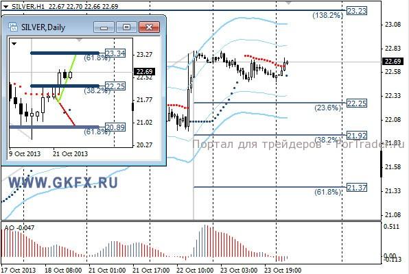Цены на серебро держались уверенней цен на золото и также указывают на продолжение роста. Традиционно делаю два варианта движения цены на неделю, основной красный и альтернативный зеленый. Значимые уровни на сегодня отмечены на часовом графике. Индикатор АО находится в отрицательной зоне и растет, указывая на коррекцию перед вероятным продолжением снижения, но вероятность этого низка. Индикатор тренда указывает на рост. Преодоление 22,80 даст возможность для покупок с целями 23,00 и 23,20.