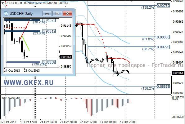 Пара USDCHF снижалась, выполнив условие для продаж. Первой цели еще не достигала, но сегодня это вероятно свершится. Стоп можно переставить в безубыток. На эту неделю традиционно рассматриваю два варианта возможного движения цены, основной красный и альтернативный зеленый. Значимые уровни на сегодня отмечены на часовом графике. Индикатор АО находится в отрицательной зоне и растет, указывая на коррекцию перед вероятным продолжением снижения. Индикатор тренда указывает на снижение. Держим продажи от 0,8940 с целями 0,8900 и 0,8885.