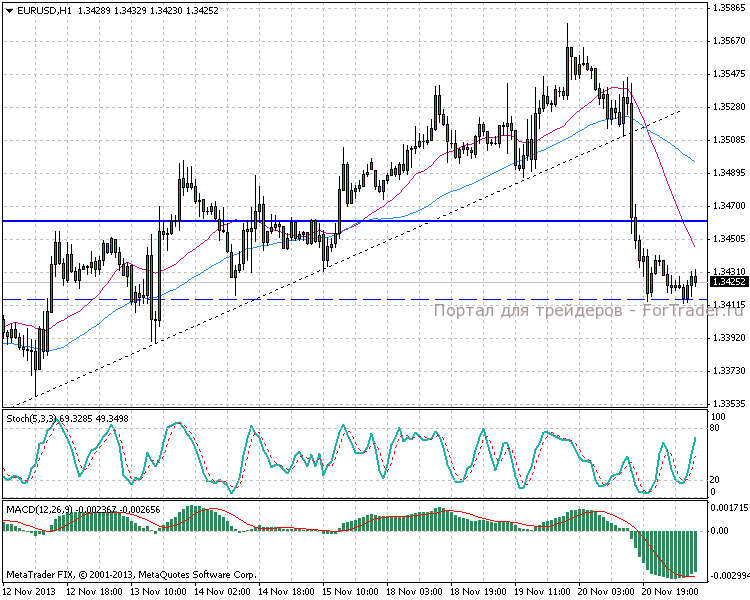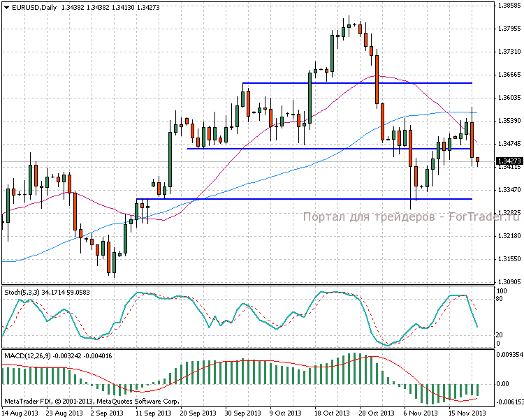 Вчера во второй половине дня прозвучали две ключевые новости. Во-первых, были опубликованы октябрьские протоколы заседания FOMC, которые оказались довольно нейтральными: сворачивание QE в декабре возможно, но более вероятно весной. Более существенным образом рынок отреагировал на слухи о планах со стороны ЕЦБ ввести отрицательные ставки на депозиты. Основная пара пробила поддержку 1,3460 и устремилась вниз. Дневной индикатор MACD вновь начал снижение.