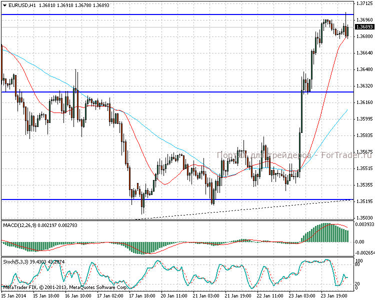 На валютный рынок вновь вернулись разговоры о потолке госдолга США. Напоминаем, что Конгрессу необходимо повысить потолок до 7 февраля. Вчерашний день ознаменован падением американских фондовых индексов и доллара США. На этом фоне основная валютная пара EUR/USD отскочила от линии тренда и выросла сразу же на 150 пунктов. Был достигнут важный уровень сопротивления 1,3700, на котором медведям удалось сдержать активность покупателей.