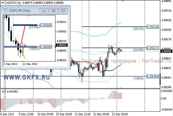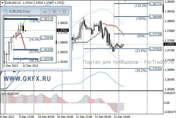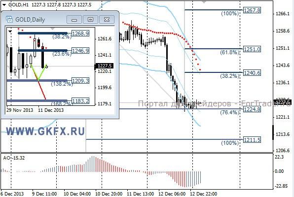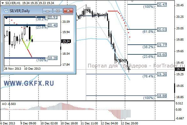 Цены на золото резко снизились на опасениях, что ФРС все же может сократить программу стимулирования на следующей неделе. Участников рынка напугало решение проблемы в виде двухстороннего соглашения по бюджету в США, так как исчезла угроза очередной приостановки правительства США. Накануне были признаки нежелания идти вверх, но я их проигнорировал. В итоге по рекомендации минус. По тренду цена летит как сумасшедшая и не надо об этом забывать. Традиционно делаю два варианта движения цены на неделю, основной красный и альтернативный зеленый. Значимые уровни на сегодня отмечены на часовом графике. Индикатор АО находится в отрицательной зоне и растет, указывая на коррекцию перед возможным продолжением снижения. Индикатор тренда указывает на снижение. Вне рынка.