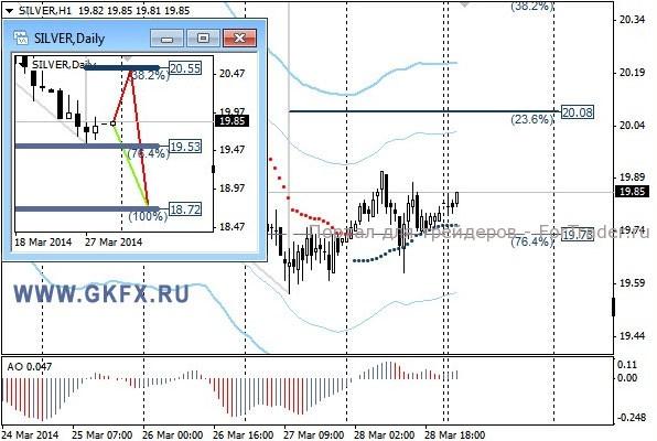 Цены на серебро соответствовали ожиданиям и корректировались. Ожидаю, как и по золоту в первой половине недели некоторой коррекции после значительного снижения накануне, а затем возможный рывок вниз к новым минимумам за последние два месяца. На дневном графике на прошлой неделе отработался зеленый вариант. Традиционно делаю два варианта движения цены на неделю, основной красный и альтернативный зеленый. Значимые уровни на сегодня отмечены на часовом графике. Индикатор АО находится в положительной зоне и растет, указывая на желание двигаться вверх в данное время. Индикатор тренда указывает на рост. Сегодня наблюдаем, сильных движений не ожидается.
