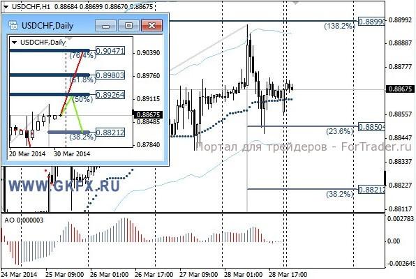 Пара USDCHF преодолела уровень 0,8870 и достигала первой цели по рекомендации на уровне 0,8895. Далее продолжения роста не последовало, и цена вернулась ниже 0,8870. Возможность поставить стоп на уровень открытия сделки была. На дневном графике на прошлой неделе отработался частично красный вариант. На эту неделю традиционно рассматриваю два варианта возможного движения цены, основной красный и альтернативный зеленый. Значимые уровни на сегодня отмечены на часовом графике. Индикатор АО находится у нуля, указывая на неопределенность. Индикатор тренда указывает на рост. Сегодня наблюдаем, сильных движений не ожидается.