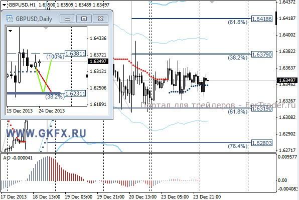 Пара EURUSD продолжила умеренный рост в рамках коррекции. Уже ощущается по динамике на рынке понижение объемов. Сегодня в большинстве ведущих стран короткий день по случаю празднования «Сочельника», а завтра католическое «Рождество». Смысла сейчас лезть в рынок не вижу. На эту неделю традиционно рассматриваю два варианта возможного движения цены, основной красный и альтернативный зеленый. Значимые уровни на сегодня отмечены на часовом графике. Индикатор АО находится в положительной зоне и снижается, указывая на коррекцию перед возможным продолжением роста. Индикатор тренда указывает на рост. Вне рынка.