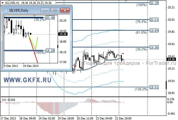 Цены на золото начинают засыпать на праздники и, по всей видимости, придут в себя только в пятницу. По этой причине рекомендуется прикрыть позиции. Традиционно делаю два варианта движения цены на неделю, основной красный и альтернативный зеленый. Значимые уровни на сегодня отмечены на часовом графике. Индикатор АО находится в отрицательной зоне и растут, указывая на коррекцию перед возможным продолжением снижения. Индикатор тренда указывает на снижение. Вне рынка.