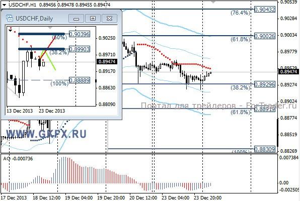 Пара USDCHF снижает активность по мере приближения праздников. Сегодня и еще два следующих дня, Швейцария отдыхает. Объемы по паре также будут на низком уровне. На эту неделю традиционно рассматриваю два варианта возможного движения цены, основной красный и альтернативный зеленый. Значимые уровни на сегодня отмечены на часовом графике. Индикатор АО находится в отрицательной зоне и растет, указывая на коррекцию перед возможным продолжением снижения. Индикатор тренда указывает на снижение. Вне рынка.