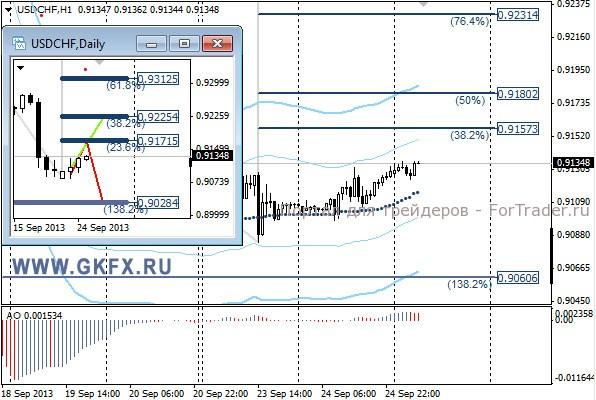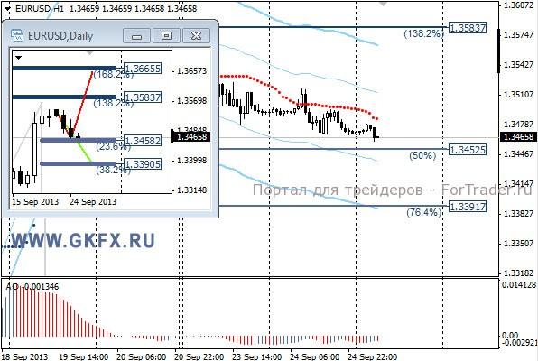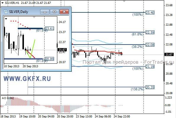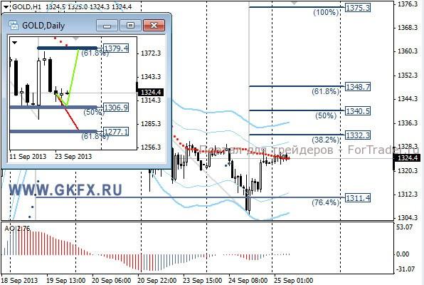 Цены на золото сделали еще один рывок вниз, но минимум от 18 сентября принижен не был, что дает возможность для восстановления цен в сторону 1400,0. Президент ФРС-Нью-Йорк Дадли вчера заявил, что сокращение ежемесячных покупок облигаций может начаться до конца 2013 года. Это сдержало рост цен на золото, однако это соответствует ожиданиям рынка и не вызвало бурной реакции. Шансы для роста цен на золото еще велики и будут оставаться такими, пока не снизятся ниже 1292,0. Традиционно делаю два варианта движения цены на неделю, основной красный и альтернативный зеленый. Значимые уровни на сегодня отмечены на часовом графике. Индикатор АО находится у нуля, указывая на неопределенность. Индикатор тренда указывает на снижение. Преодоление 1332,0 даст возможность для покупок с целями 1340.0, 1347.0 и 1353.0.