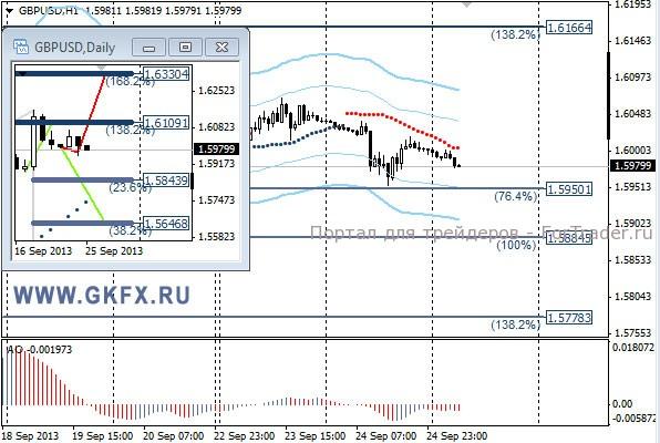 Пара EURUSD закончила торги некоторым понижением, так как отчет Ifo оказался хуже прогнозов. Плюс ко всему член Управляющего совета ЕЦБ Эвальд Новотны заявил, что использование LTRO обсуждается советом. Это значит, что ЕЦБ может расширить программу поддержки банков. Подобные комментарии вызвали понижение евро. Однако понижение носит по-прежнему коррекционный характер и ускорения снижения не наблюдается. Следовательно, еще есть шанс на резкий рост пары. По рекомендации сработало условие для продаж. На эту неделю традиционно рассматриваю два варианта возможного движения цены, основной красный и альтернативный зеленый. Значимые уровни на сегодня отмечены на часовом графике. Индикатор АО находится в отрицательной зоне и растет, указывая на коррекцию перед возможным продолжением снижения. Индикатор тренда указывает на снижение. Держим продажи с целями 1,3455 и 1,3395.