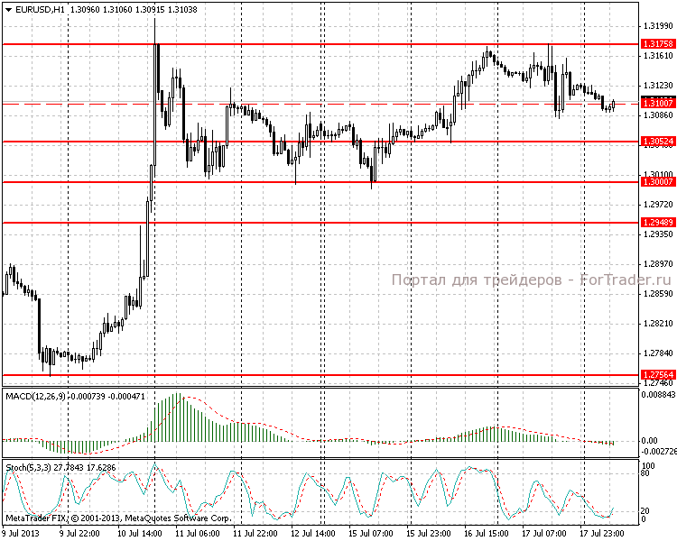 При переходе на младший таймфрейм наблюдаем боковое движение, цена снизилась до круглого уровня 1,3100, в очередной раз проверяя его силу. Высота столбиков часового MACD весьма невелика, тем самым подтверждая временное отсутствие направленного движения на рынке. Линии часового стохастика пересеклись и начали выход из зоны перепроданности – неплохой сигнал в пользу быков.