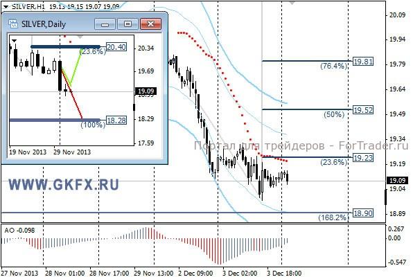 Цены на серебро исполнили условие для продаж в отличие от золота. Если сегодня все пойдет по сценарию, то сделка закроется с профитом. Традиционно делаю два варианта движения цены на неделю, основной красный и альтернативный зеленый. Значимые уровни на сегодня отмечены на часовом графике. Индикатор АО находится в отрицательной зоне и растет, указывая на коррекцию перед возможным продолжением снижения. Индикатор тренда указывает на снижение. Дердим продажи от 19,10 с целями 18,75 и 18,25.