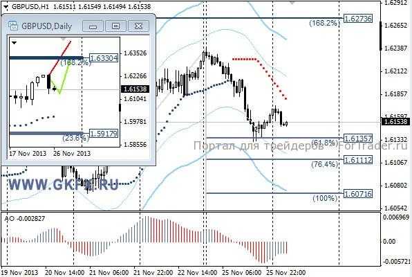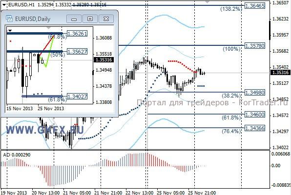 Пара EURUSD снижалась на протяжении азиатских и европейских торгов на фоне соглашения между Ираном и шестью мировыми державами, в том числе США. Соглашение подразумевает ослабление некоторых экономических санкций против Ирана, на что тот обязуется произвести частичную приостановку его ядерной программы. На американских торгах доллар ослаб на фоне слабой статистике по США. Сегодня ожидаю возобновления роста пары. На эту неделю традиционно рассматриваю два варианта возможного движения цены, основной красный и альтернативный зеленый. Значимые уровни на сегодня отмечены на часовом графике. Индикатор АО находится у нуля, указывая на неопределенность в данное время. Индикатор тренда указывает на рост. Преодоление 1,3540 даст возможность для покупок с целями 1,3555 и 1,3575.