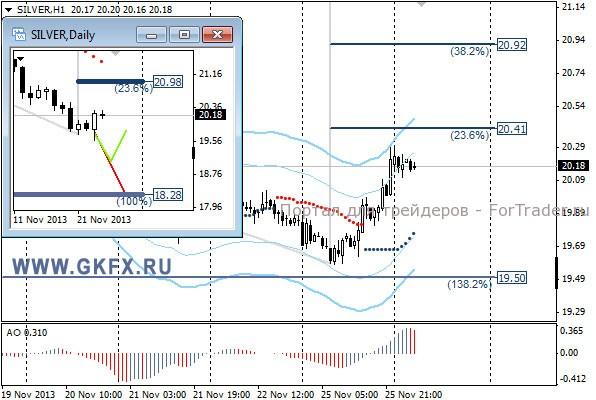 Цены на золото снизились в соответствии с ожиданиями отчасти под влиянием принятого соглашения Ирана и шести ведущих государств о смягчении санкций в обмен на заморозку ядерной программы. По рекомендации первая цель была достигнута, однако продолжения не последовало, так как по США выходила слабая статистика, и доллар в итоге сдал позиции. Золото на фоне этого резко набрало позиции закрыв продажи по безубытку. Традиционно делаю два варианта движения цены на неделю, основной красный и альтернативный зеленый. Значимые уровни на сегодня отмечены на часовом графике. Индикатор АО находится в положительной зоне и снижается, указывая на коррекцию перед возможным продолжением роста. Индикатор тренда указывает на рост. Вне рынка.