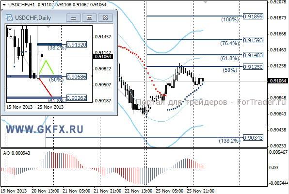 Пара USDCHF достаточно уверенно росла, закрыв сделку на продажу по стопу. Стоп был короткий, поэтому не смертельно. Ситуация двоякая, но думаю что движение вниз возобновится. Рекомендаций по этой паре не даю, хватит пока евро. На эту неделю традиционно рассматриваю два варианта возможного движения цены, основной красный и альтернативный зеленый. Значимые уровни на сегодня отмечены на часовом графике. Индикатор АО находится в положительной зоне и снижается, указывая на коррекцию перед возможным продолжением роста. Индикатор тренда указывает на рост. Вне рынка.