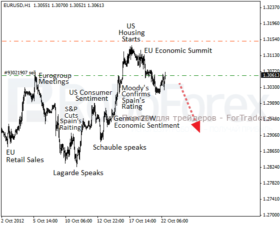 Какой-то важной макроэкономики на понедельник не запланировано. Скорее всего, EUR/USD продолжит снижение, поскольку итоги саммита лидеров ЕС выбили всю почву из под копыт евробыков. На локальной коррекции открыл сделку на продажу, стоп по которой при первой же возможности переведу на безубыток. Наверняка в течение недели на рынок будет поступать всё больше медведей, что может обернуться походом, как минимум, к уровню 1,2700. Турбулентность в еврозоне будет этому только способствовать.
