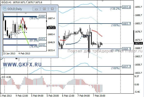 Цены на золото попытались выйти из диапазона во время пресс-конференции президента ЕЦБ Драги, совершая резкие колебания, но безуспешно. По-видимому золото не нашло продавцов на низких уровнях и вернулось в прежний диапазон. Раз вчера не хватило мотивации для выхода из диапазона, то сегодня наверняка торги в нем продолжаться. На дневном графике делаю два варианта движения цены на неделю, основной красный и альтернативный зеленый, склоняюсь к красному. Значимые уровни на сегодня отмечены на часовом графике. Индикатор АО в отрицательной зоне и растет, указывая на коррективное движение цены. Индикатор тренда указывает на снижение, но пока его можно не смотреть. Buy 1668.00 и ниже со стопом 1662,00. Цель 1677,0.