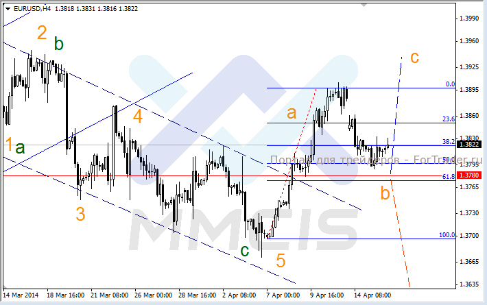 В течение вчерашнего дня пара евро/доллар протестировала уровень 50% от своего роста за период с 7 по 10 апреля и вплотную подошла к уровню поддержки 1.3780. По мнению аналитиков, сейчас наблюдается завершение отката в волне «b», после чего ожидается рост в волне «с».