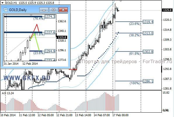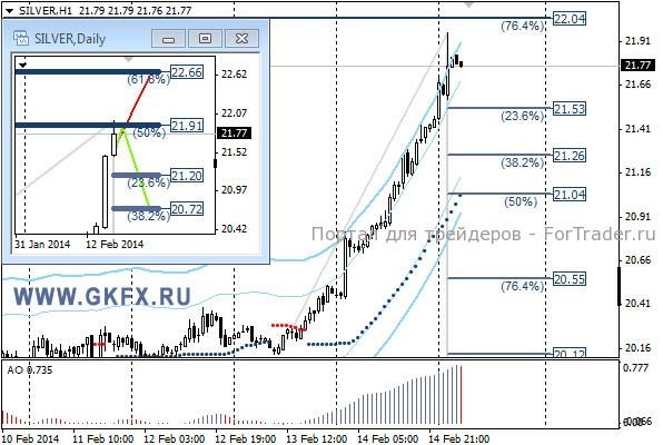 Цены на золото немного не дошли до отметки 1322,0, которая была названа конечной на прошедшей неделе. Также эта отметка была второй целью по рекомендации, которая полностью отработалась сегодня утром. На этой неделе рост цен на золото может продолжиться, но лучше дождаться подтверждения, от американских участников торгов. На дневном графике на прошлой неделе не отработался не один из вариантов. Традиционно делаю два варианта движения цены на неделю, основной красный и альтернативный зеленый. Значимые уровни на сегодня отмечены на часовом графике. Индикатор АО находится в положительной зоне и растет, указывая на желание цены двигаться вверх. Индикатор тренда указывает на рост. Вне рынка.