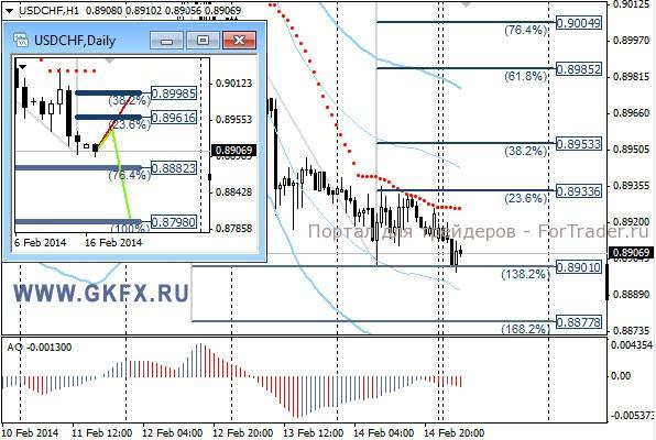Пара USDCHF застопорилась выше 0,8900 и никак не может пройти этот уровень. Это привело к отрицательному результату по сделке. На продажу пока не работаем, есть серьезные сложности при снижении. На дневном графике на прошлой неделе частично отработался красный вариант. На эту неделю традиционно рассматриваю два варианта возможного движения цены, основной красный и альтернативный зеленый. Значимые уровни на сегодня отмечены на часовом графике. Индикатор АО находится в отрицательной зоне и снижается, указывая на желание пары двигаться вниз в данное время. Индикатор тренда указывает на снижение. Вне рынка.