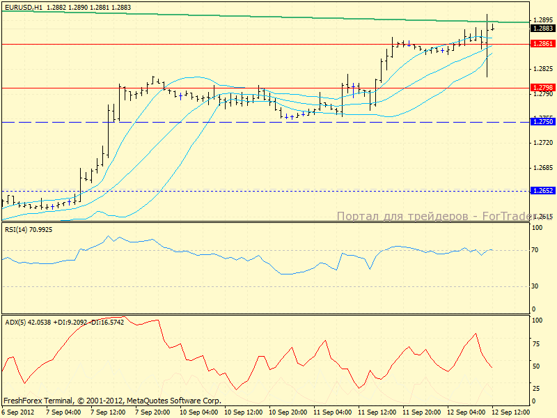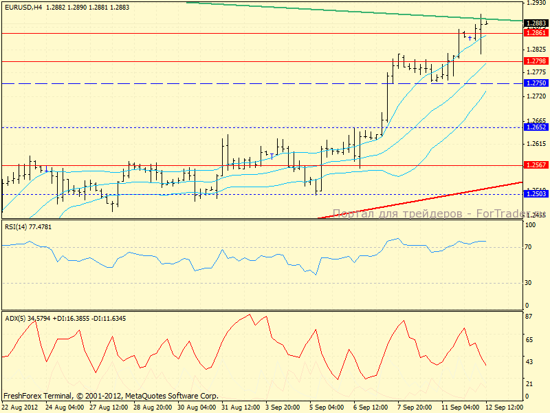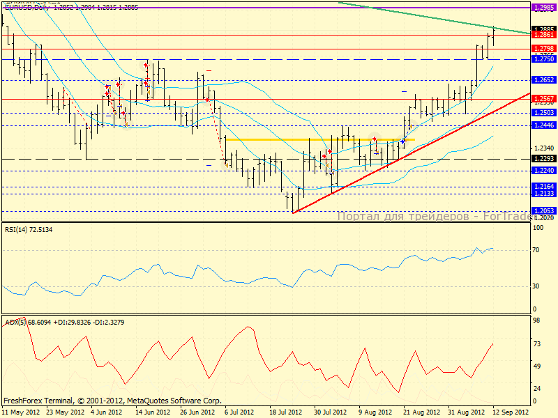 Дневной график: глобальная нисходящая трендовая достигнута. Может хватит, товарищи быки?:) Единственным (и главным) аргументом для продолжения роста является пробитый вчера ИБ (справедливости ради отметим, что пробитый очень уверенно). А чисто технически очень напрашивается сильная коррекция внутри своеобразного треугольника между двумя трендовыми, со среднесрочной целью 1.2567 (средняя Боллинджера). Так же видна очень сильная ппз в районе 1.2985. Если цена без коррекции дотянется туда, то не сомневаюсь, что евро встретит интенсивные фиксации и продажи.