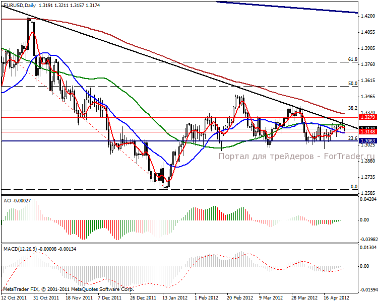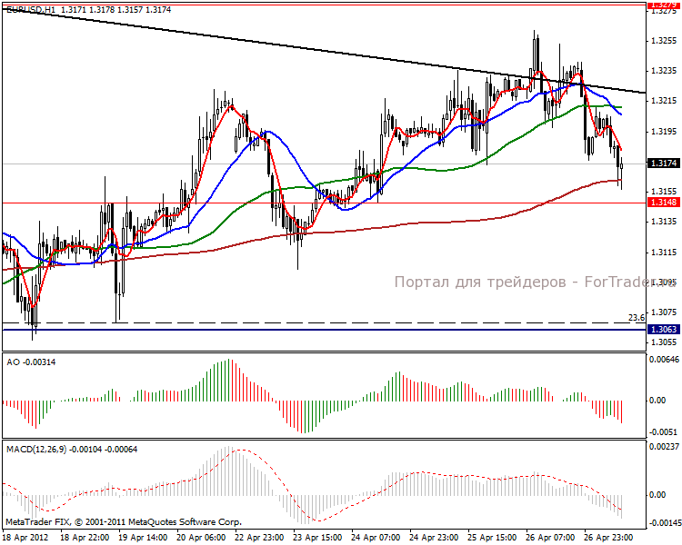 На часовом графике произошел отскок цены от линии основного тренда, наблюдаем разворот тенденции. В краткосрочной перспективе пробьем поддержку в отметке 1.3148 пунктов, после чего пощупаем уровень 1.3063 пункта.