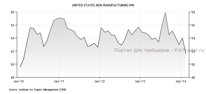 Индекс деловой активности в сфере услуг США от ISM неожиданно упал в феврале до минимума с февраля 2010 года на уровне 51,6 п. с 54 п. в январе, тогда как ожидалось лишь небольшое снижение до 53,5 п. Снизились подындексы занятости, цен и деловой активности. Наибольшее снижение показал подындекс занятости, который упал в феврале до 47,5 с 56,4, опустившись ниже отметки 50 впервые за два года, что особенно тревожно перед отчетом по рынку труда США в пятницу.