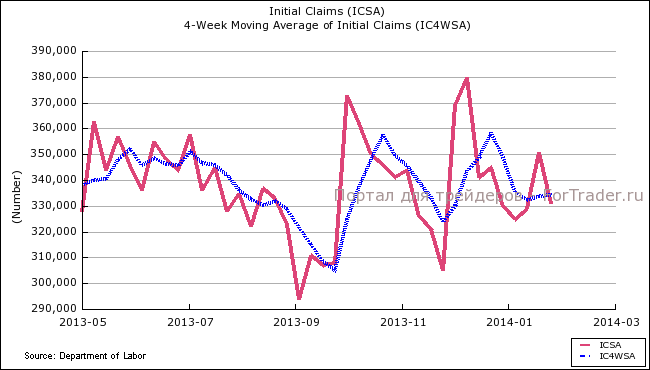 Число первичных заявок на пособие по безработице в США на прошлой неделе снизилось на 20 тыс. до 331 тыс., с пересмотренных в сторону повышения 351 тыс., что оказалось лучше ожидавшихся 335 тыс. Число заявок на пособие снизилось впервые за три недели. Среднее число заявок за последние 4 недели незначительно выросло до 334 тыс. с 333,75 тыс. неделей ранее.