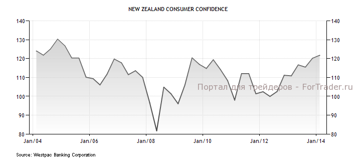 Новозеландский доллар вырос на фоне укрепления потребительского доверия в Новой Зеландии до 9-летнего максимума. Индекс потребительских настроений от Westpac вырос в 1-м квартале 2014 года до 121,7 п. по сравнению с 120,1 п. в 4-м квартале прошлого года.